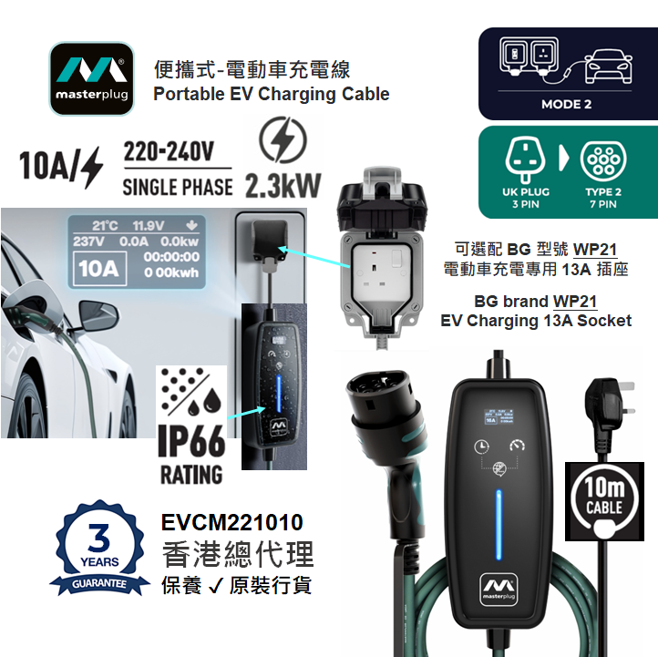 英國 Masterplug 便攜式電動車 EV 充電線 10米 Type2-13A 插頭 EVCM221010 模式 2 單相 2.3kW LED IP66 香港總代理