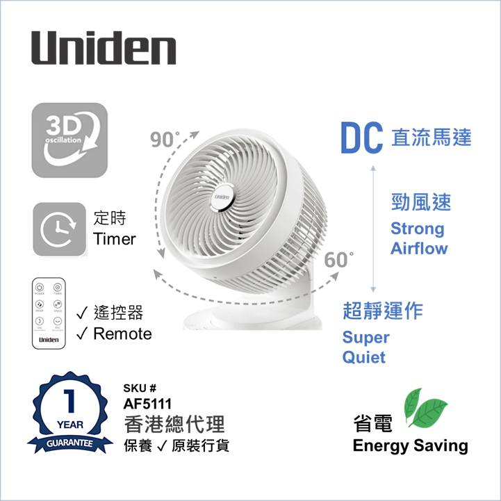UNIDEN 日本品牌 DC超靜-勁風速 3D 循環搖擺-室內座枱節能風扇 9吋 AF5111 香港總代理
