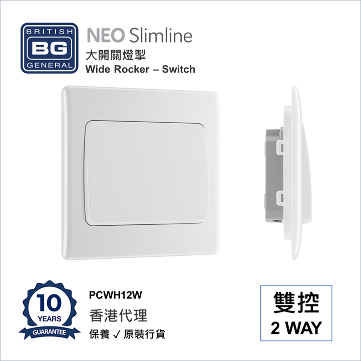 BRITISH GENERAL - BG Neo Slimline 大按燈掣 Wide Rocker 20A/16AX 雙控一位 PCWH12W 白 香港代理