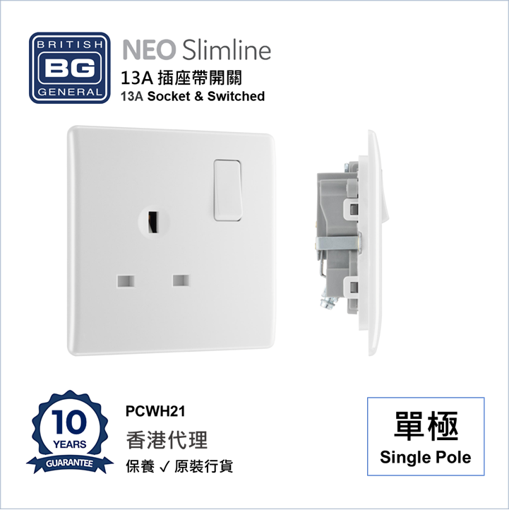 BRITISH GENERAL - BG Neo Slimline 13A 插座帶開關  Socket & Switched 單極 1位 PCWH21 白-香港代理