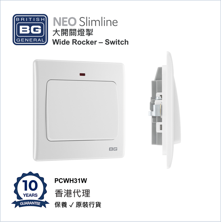 BRITISH GENERAL - BG Neo Slimline 大按燈掣 Wide Rocker 20A/16AX 20A 雙極 1位 PCWH31W 白-香港代理