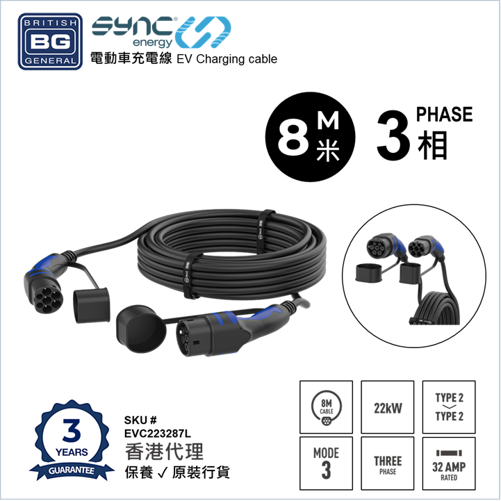 英國品牌 BG Sync Energy EVC22328TL EV電動車充電線 8米 22kW Type2-2 Mode3 三相 3Phase IP65 防水-防UV 不易變形 British General 香港代理