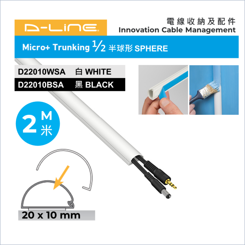 英國品牌 D-LINE 家居DIY電線膠槽 D22010WSA / D22010BSA (2條裝) ½半球形20x10mm 2米長-帶強力背膠貼-靈活開關 (加減電線) 香港總代理