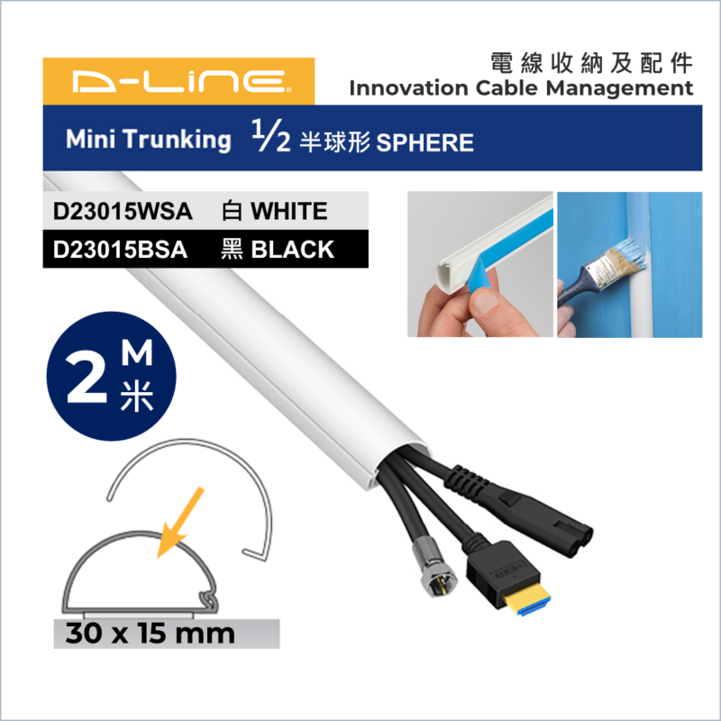 英國品牌 D-LINE 家居DIY電線膠槽 D23015WSA / D23015BSA (2條裝) ½半球形30x15mm 2米長-帶強力背膠貼-靈活開關 (加減電線) 香港總代理