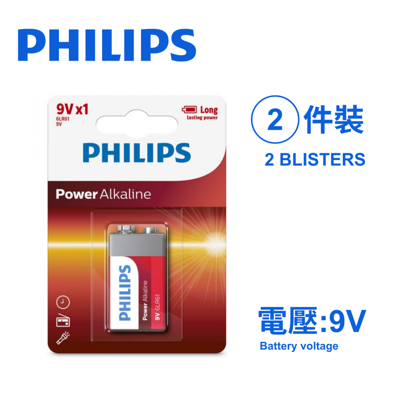 Philips 飛利浦 鹼性電池 9V [ 2件裝 = 2粒 ] 6LR61P1B/97