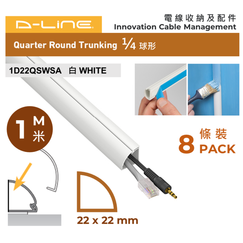 英國品牌 D-LINE 電線膠槽 1D22QSWSA (八條裝) ¼ 球形 22 x 22mm 1米長-帶強力背膠貼 DIY 靈活開關 (加減電線)